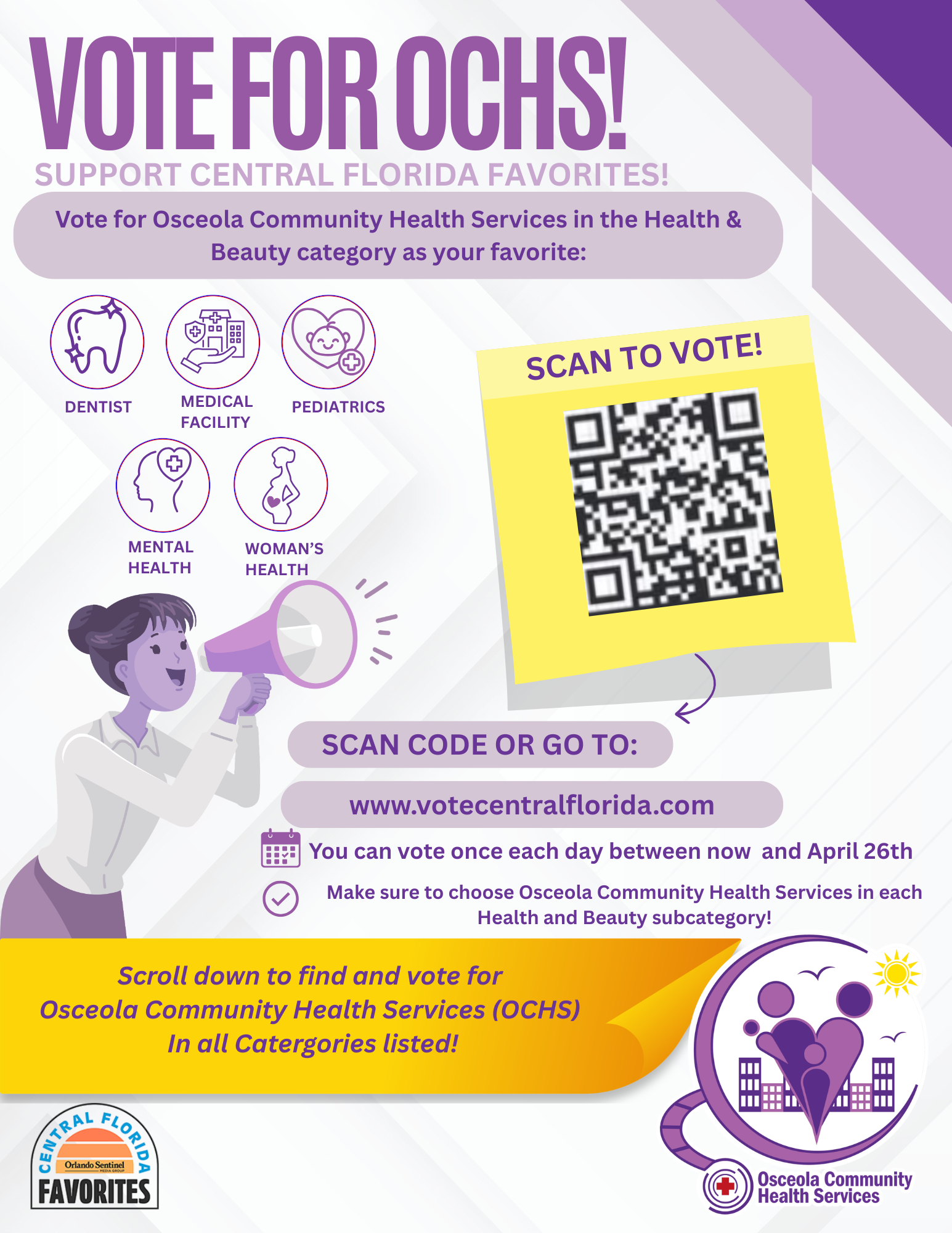 We're honored to be nominated in five Health & Beauty categories by the Orlando Sentinel — and we need your support! Cast your daily vote for Osceola Community Health Services in Dentistry, Medical Facility, Pediatrics, Mental Health Services, and Women's Clinic through April 26th.